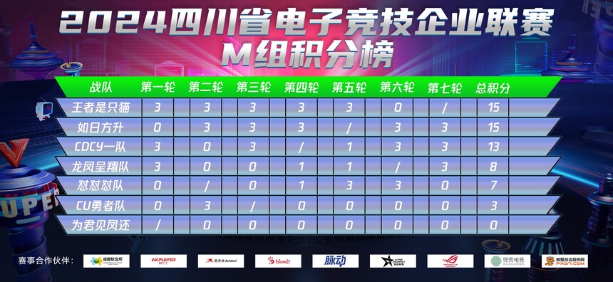 企业赛事2024四川省电子竞技企业联赛之第七轮赛果【2024四川省电子竞技企业联赛】 第七轮比赛已结束 感谢所有队伍给我们带来的精彩对局! 现公布第七轮比赛积分榜和高手榜 期待选手们在后续比赛中的精彩发挥! 积分榜